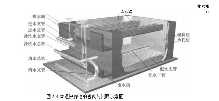 快濾池一般用鋼筋混凝土建造,它內(nèi)有排水槽,濾料層,墊料層和配水系統(tǒng); 外有集中管廊,配有進(jìn)水管,出水管,沖洗水管,沖洗水排出管等管道及附件.
