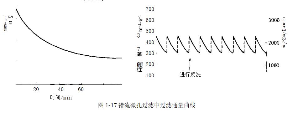 采用定期原位反沖洗對膜的清洗是有效果的.這種沖洗方式可以產(chǎn)生“鋸齒”形通量變化曲線(圖1-17),最終也會逐漸衰減為低通量
