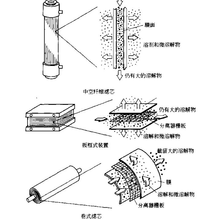 不同種類的膜組件:平板、管狀和毛細(xì)管.后來發(fā)展起來的有中空纖維形式膜組件.