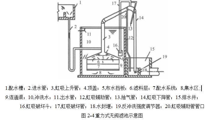 虹吸濾池的濾料組成和濾速選定與普通快濾池相同,采用小阻力配水系統(tǒng).所不同的是利用虹吸原理進(jìn)水和排走反洗水.
